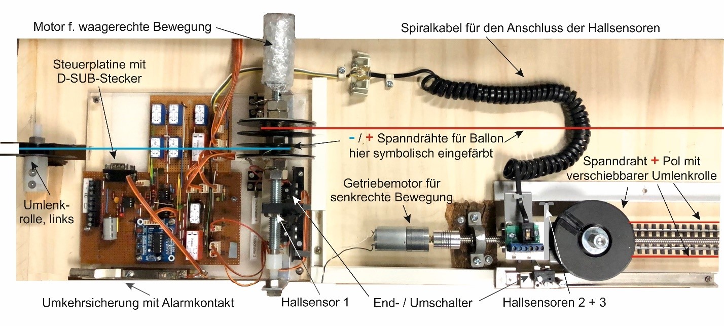 Die Lösung: Der Ballon wird an 2 sehr dünnen Drähten aufgehängt. Jeder dieser Drähte wird über mehrere Umlenkrollen geführt. Die Rollen sind ca. 1,70 m voneinander entfernt und befinden sich auf einem Brett dezent verdeckt oberhalb der abgehängte Kastendecke. Von diesen Rollen führt der Draht zu einer Welle, auf der 2 Spulen angeordnet sind. Dabei ist die Wickelrichtung so angeordnet, dass die Drähte gegenseitig gewickelt werden; d.h. wenn die Welle sich dreht, wird der eine Draht abgewickelt und der andere aufgespult. Der Ballon bleibt annähernd in der gleichen Höhe, wird sich aber etwas anheben, wenn er sich einer der Umlenkrollen nähert. Außerdem kann der Ballon landen. Für eine Landung muss ein Spanndraht verlängert werden. Die nähere Beschreibung erfolgt unten weiter.